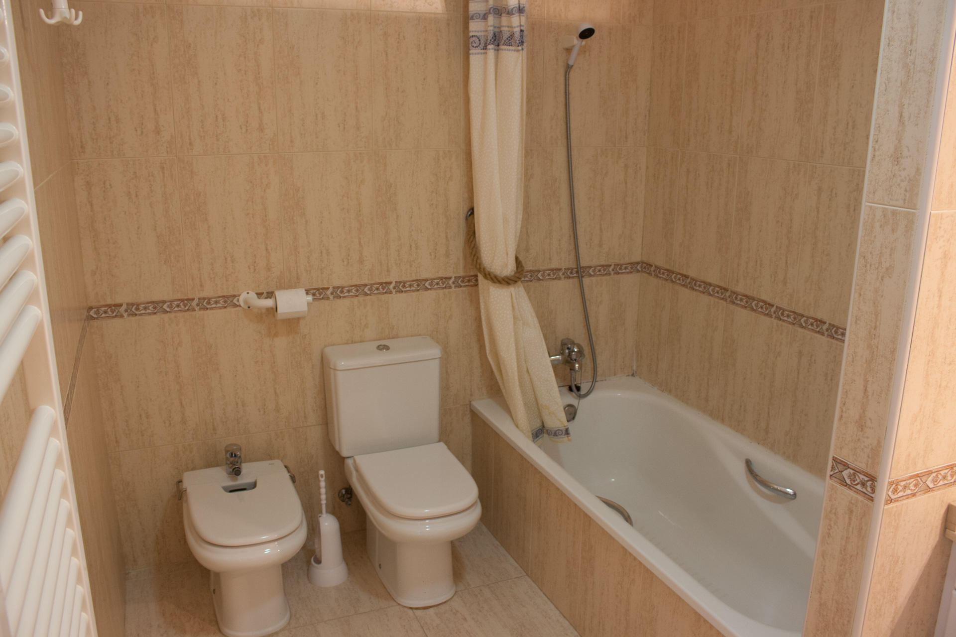 Badkamer met bad, douche, wastafel, toilet en bidet.